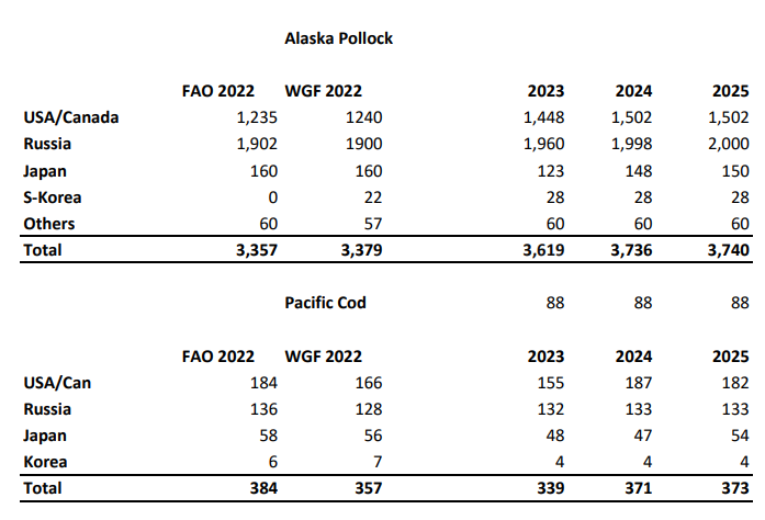 全球黑线鳕的产量预计也将小幅下降,降幅为9%,至26.9万吨;绿青鳕的供应预计减少6%,降至36万吨。在这两种情况下,挪威是受到影响最大的国家,黑线鳕的产量预计将从2023年的9.4万吨降至5.7万吨,而绿青鳕的产量预计将从今年的24.3万吨降至21.7万吨。