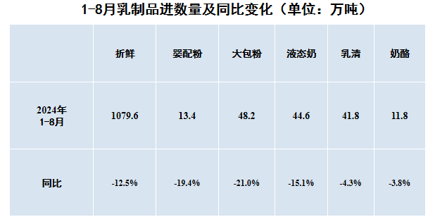 1—8月,我国进口各类乳制品174.9万吨,同比降13.2%,折合生鲜乳1079.6万吨,同比降12.5%(干制品按1:8,液态奶按1:1折算);进口额73.8亿美元,同比降16.1%。