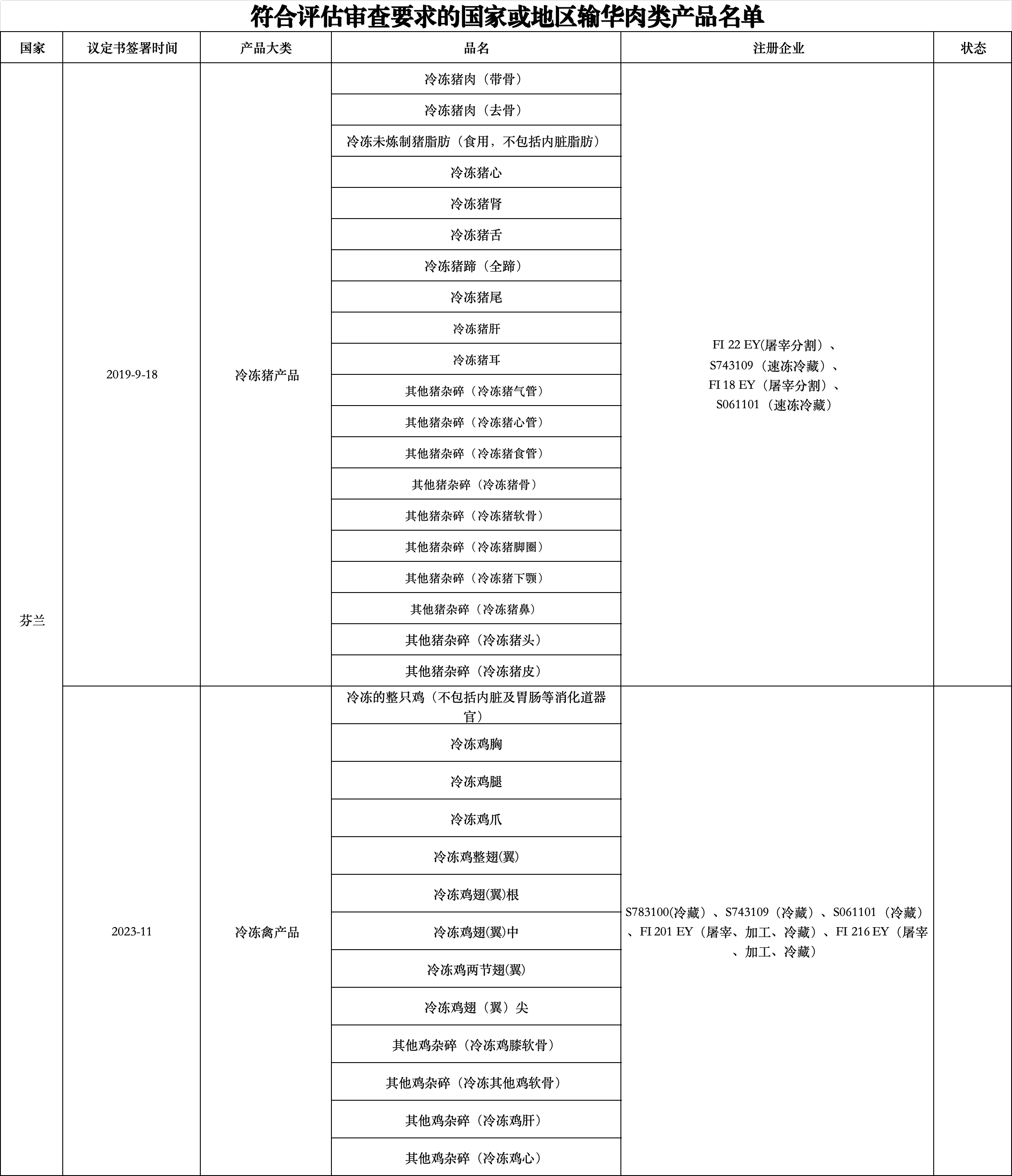 新增芬兰2家禽肉企业(注册编号为FI 201 EY、FI 216 EY)自2024年10月29日及之后生产的符合中国要求的禽肉产品输华。