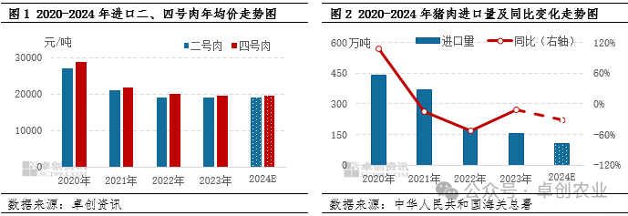 1. 2020-2024年猪肉进口量及价格皆呈跌后企稳走势