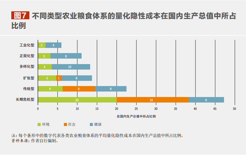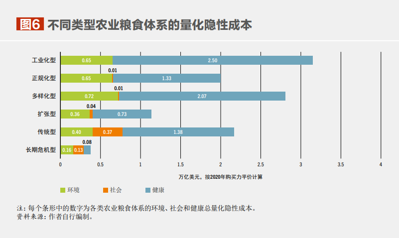 除膳食风险外,不可持续的农作方式所导致的环境影响也大幅增加了隐性成本。与温室气体排放、氮径流损失、土地利用方式变化、水污染相关的成本在属于多样化型农业粮食体系的国家(快速经济增长伴随着不断变化的消费和生产模式)中尤其突出,估计达7200亿美元。正规化型和工业化型农业粮食体系也面临着巨大的环境成本。而处于长期危机的国家所承受的相对环境成本却最高,相当于其国内生产总值的20%。