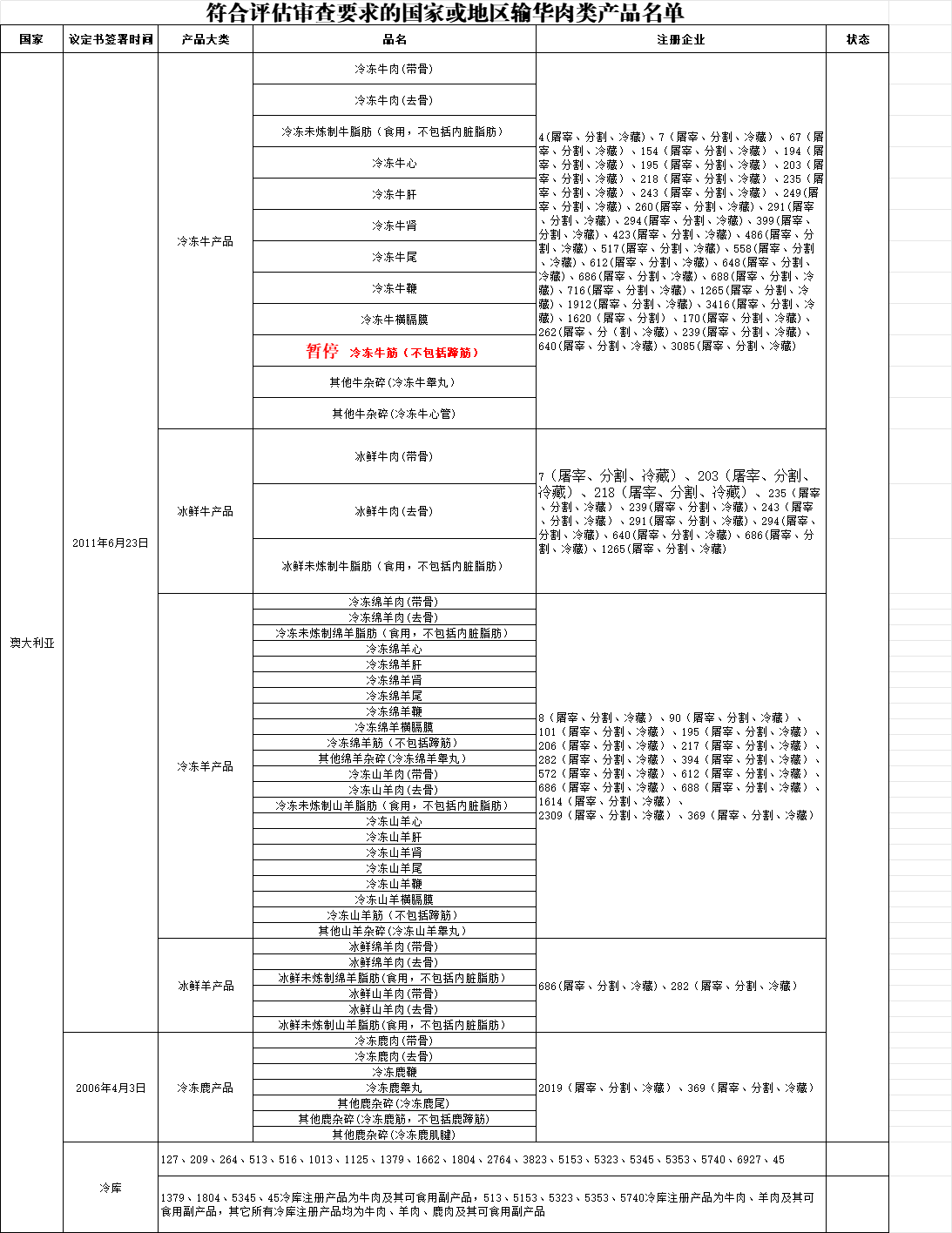 近日,海关总署更新《符合评估审查要求的国家或地区输华肉类产品名单》: