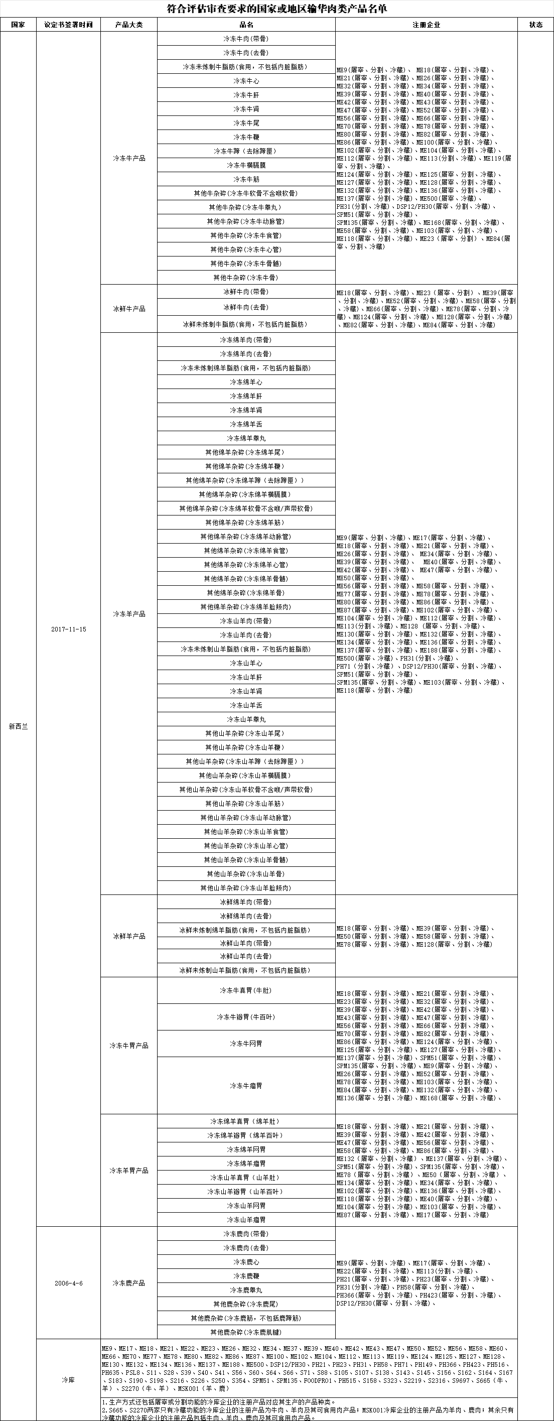 新增新西兰1家冷库企业(注册编号为MSK001)自2024年12月3日及之后贮存的符合中国要求的肉类产品输华。