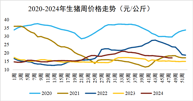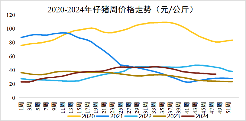 仔猪价格继续下跌:自2024年8月第4周起仔猪价格累计15周下跌,累计下跌10.67元,跌幅达23.9%。2024年11月第4周全国仔猪平均价格34.01元/公斤,环比下跌0.3%,同比上涨43.4%。上海、江西、广西、江苏、安徽等10个省份仔猪价格上涨,辽宁、黑龙江、河北、天津、吉林等19个省份仔猪价格下跌。华南地区价格较高,为36.69元/公斤;西南地区价格较低,为32.30元/公斤。