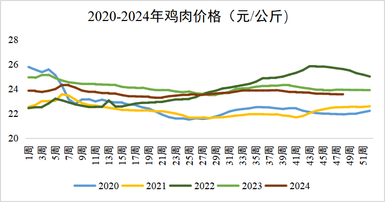 鸡肉价格小幅下跌:2024年11月第4周全国鸡肉平均价格23.54元/公斤,环比下跌0.1%,同比下跌1.6%。商品代蛋雏鸡平均价格3.99元/只,环比上涨0.5%,同比上涨8.7%。商品代肉雏鸡平均价格3.75元/只,环比上涨0.3%,同比上涨16.1%。