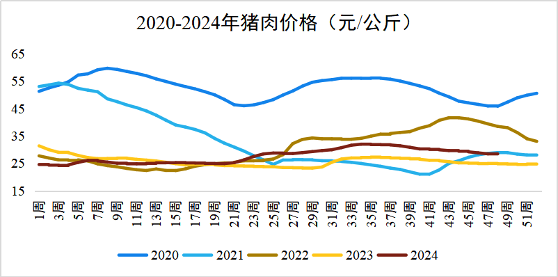 猪肉价格继续下跌:自2024年8月第5周起生猪价格连续14周下跌,累计下跌3.63元,跌幅达11.4%。2024年11月第4周全国猪肉平均价格28.34元/公斤,环比下跌0.4%,同比上涨14.2%。江西、天津、广东、重庆、福建等7个省份猪肉价格上涨,山西、内蒙古、青海、安徽、河北等21个省份猪肉价格下跌,海南、贵州2个省份价格持平。华南地区价格较高,为30.25元/公斤;东北地区价格较低,为25.64元/公斤。