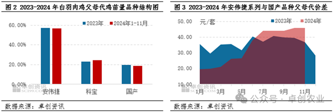 其次,2024年1-11月国产品种父母代鸡苗月度更新量同比减少,且占比下降。据卓创资讯数据统计,2023年国产品种父母代鸡苗月度更新量占比可达19.67%,但2024年1-11月其占比降至18.82%,同时更新量较2023年1-11月减少2.98%,因此国内父母代种鸡企业对国产品种父母代鸡苗认可度降低。综合国产品种父母代鸡苗成交价格及更新量来看,2024年其推广效果不及预期,企业将重心由增量向提质转移,计划2025年祖代种鸡更新量较2024年略降。