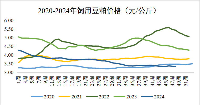 豆粕价格继续下跌:全国豆粕平均价格3.33元/公斤,环比下跌0.6%,同比下跌24.5%。