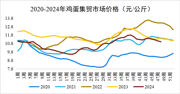 鸡蛋价格继续下跌:2024年11月第4周全国鸡蛋平均价格11.01元/公斤,环比下跌0.8%,同比下跌3.9%。河北、辽宁等10个主产省份鸡蛋价格9.90元/公斤,环比下跌1.1%,同比下跌4.1%。