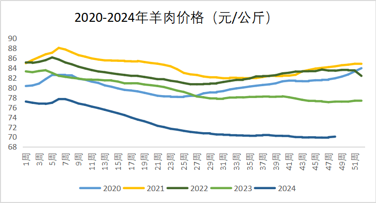 羊肉价格继续上涨:2024年11月第4全国羊肉平均价格70.05元/公斤,环比上涨0.2%,同比下跌9.2%。河北、内蒙古、山东、河南、四川、甘肃和新疆等主产省份羊肉价格64.04元/公斤,环比上涨0.2%。