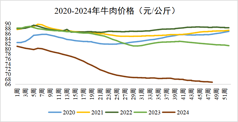 牛肉价格继续下跌:2024年11月第4周全国牛肉平均价格66.76元/公斤,环比下跌0.2%,同比下跌18.3%。河北、内蒙古、吉林、黑龙江、山东和新疆等主产省份牛肉价格55.13元/公斤,环比下跌0.3%。