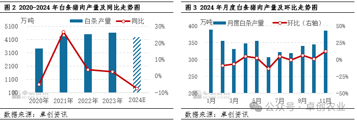 根据国家统计局数据显示,2020-2023年以来,猪肉产量呈现逐年增加走势,2024年小幅下跌,但白条占猪肉总产量的比重却逐年下滑,根据卓创资讯数据调研显示,截止到2024年11月底,白条占猪肉总量比重达80.55%,较2020年下降3.14个百分点。从屠宰环节猪肉形式看,白条仍然是屠宰企业出厂主流模式,但近些年来,由于猪肉产量基数较大,猪肉价格下行压力增加,屠宰企业毛利值偏低,因此分割、入库及熟食加工等形式挤占白条占比,白条比重下滑。但由于猪肉产量基数较大,仍然支撑白条产量居高位。