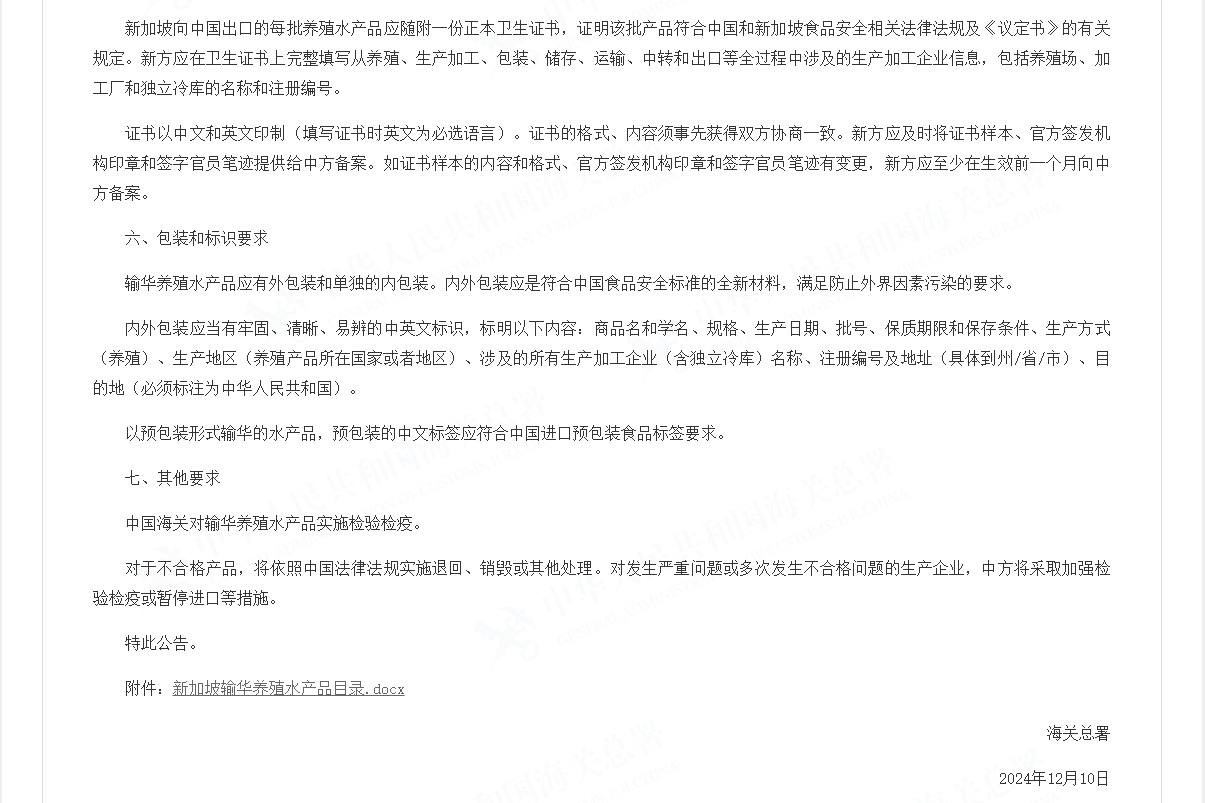 根据我国相关法律法规和中华人民共和国海关总署与新加坡共和国永续发展与环境部关于新加坡输华养殖水产品检验检疫要求规定,即日起,允许符合以下相关要求的新加坡养殖水产品进口: