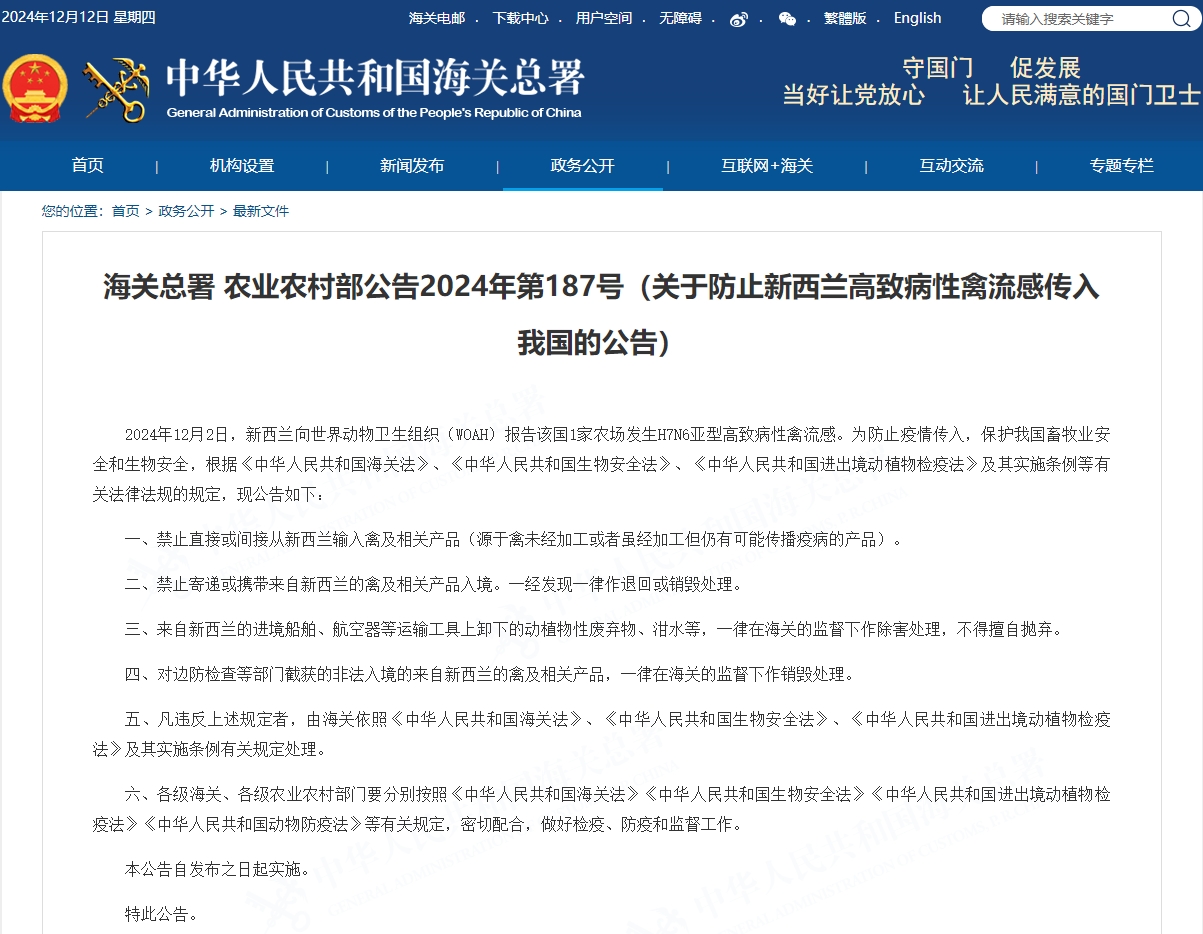 2024年12月2日,新西兰向世界动物卫生组织(WOAH)报告该国1家农场发生H7N6亚型高致病性禽流感。为防止疫情传入,保护我国畜牧业安全和生物安全,根据《中华人民共和国海关法》、《中华人民共和国生物安全法》、《中华人民共和国进出境动植物检疫法》及其实施条例等有关法律法规的规定,现公告如下: