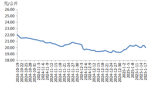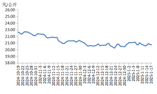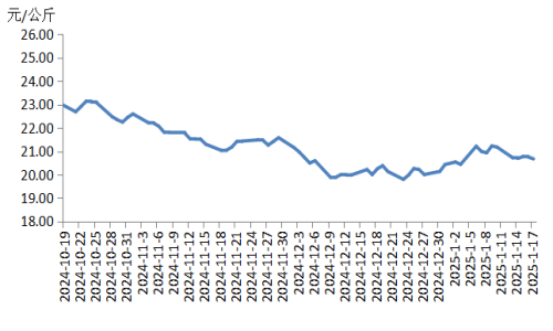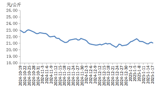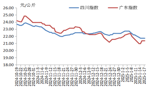据农业农村部信息中心和山东卓创资讯股份有限公司联合监测,2025年第3周(即2025年1月13日-17日,以下简称本周),16省(直辖市)瘦肉型白条猪肉出厂价格总指数的周平均值为每公斤21.01元,环比下跌1.8%,同比上涨12.4%,较上周涨幅收窄3.2个百分点。