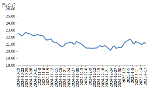 本周,四川地区猪肉周均价为每公斤21.75元,环比下跌2.9%,同比上涨21.3%,较上周涨幅收窄3.7个百分点。周初,川内生猪供应较充沛,屠宰企业收购顺畅,猪肉供应宽松,而腌腊活动基本结束,对猪肉需求减少,导致猪肉价格下跌。周中后期受周边市场猪肉价格上涨影响,屠宰企业有挺价意向,支撑猪肉价格趋稳。