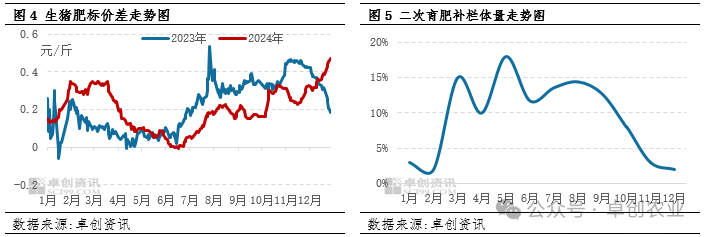 养殖端偏好短周期育肥模式,二次育肥热度提升。据卓创资讯监测与评估,2024年二次育肥补栏体量同比上升,最高为5月份的18%,次高为3月份的15%。2023年四季度北方猪病导致生猪存栏与能繁母猪存栏去化,部分养殖端空栏严重,同养殖户风险意识提高,选择从自繁自养向二次育肥养殖模式转变。年内饲料价格低位,养殖成本下滑,养殖户盈利空间增大,支撑2024年二次育肥热度整体较高,亦支撑生猪交易均重提升。