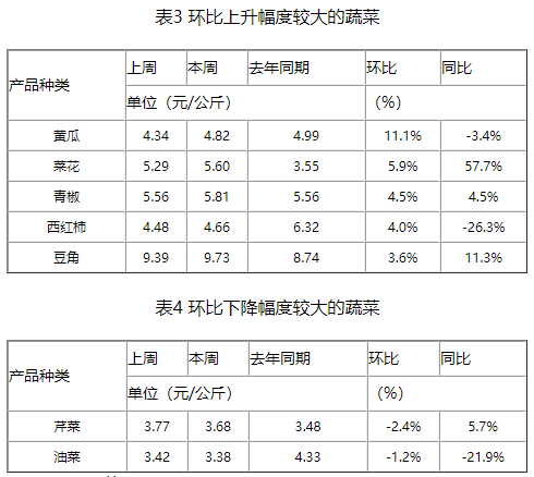 监测的19种蔬菜价格中,本周黄瓜、菜花、青椒、西红柿和豆角的价格环比涨幅较大,幅度分别为11.1%、5.9%、4.5%、4.0%和3.6%(如表3所示);芹菜和油菜的价格环比降幅较大,幅度为2.4%和1.2%(如表4所示)。