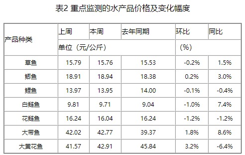 本周,重点监测的水产品草鱼、鲫鱼、鲤鱼、白鲢鱼、花鲢鱼、大带鱼和大黄花鱼与上周相比,变化幅度在-1.2~3.2%之间(如表2所示)。