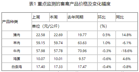 本周重点监测的畜禽产品猪肉、羊肉、牛肉、鸡蛋和白条鸡与上周相比,变化幅度在-0.6~1.0%之间(如表1所示)。