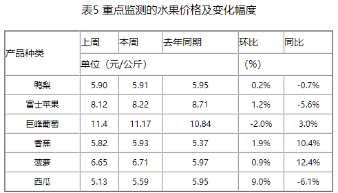 本周重点监测的6种水果平均价格为7.26元/公斤,比上周上升1.3%,同比上升1.8%(如表5所示)。