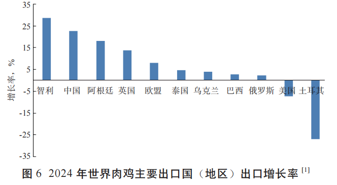 由图6可知,智利和中国的肉鸡出口量均有较大幅度上升,增长率分别为28.57%和22.74%;土耳其的肉鸡出口量出现大幅度下降,较 2023年下降27.02%。
