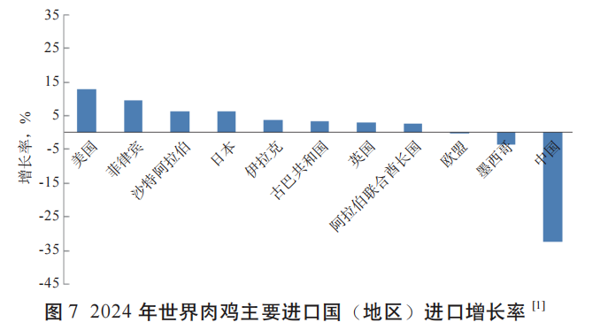 2024年世界肉鸡进口量为1 106.50万t,较2023年下降1.34%。肉鸡进口量居于前3位的国家依旧是日本、墨西哥和英国,进口量分别为113.00、97.00、96.50万t(表3)。其中,墨西哥的肉鸡进口量较2023 年有所下降;日本和英国均实现了增长,增长率分别为 6.30%和3.21%。在世界四大肉鸡主产国(地区)中,由于国内鸡肉供应充足以及受国际禽流感影响,中国2024年肉鸡进口量为51.00万t,较2023年下降了32.54%,成为2024年全球肉鸡进口下降幅度最大的国家。美国的肉鸡进口增长率为13.11%,居于首位(图7)。新兴经济体国家中,受非洲猪瘟复发、土地面积有限、投入成本高的影响,菲律宾和沙特阿拉伯的肉鸡进口增长率居于前2位,分别为9.84%和6.38%。