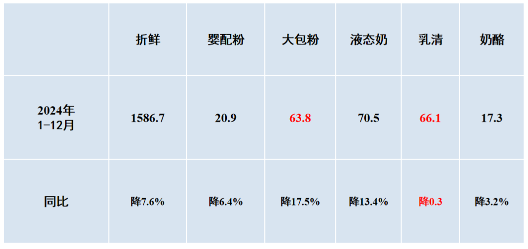 3.液态奶、乳清粉和奶酪。1—12月,液态奶进口70.5万吨,同比降13.4%;进口额14.9亿美元,同比降6.3%。乳清粉进口66.1万吨,同比降0.3%;进口额8.1亿美元,同比降6.1%。奶酪进口17.3万吨,同比降3.2%;进口额9.0亿美元,同比降7.5%。