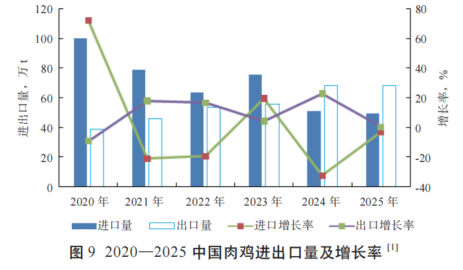 2024年,受国内肉鸡供应较为充足、国际禽流感等因素影响,中国肉鸡进口量大幅度下降至51.00万t,较2023年下降24.60万t,降幅高达32.54%。同时,中国肉鸡出口量增长至68.00万t,较2023年增长12.60万t,增长率高达22.74%。出口量增长的原因,一方面是由于全球消费者对鸡肉这一价格相对较低的动物蛋白需求的增加,另一方面是随着中国共建“一带一路”倡议的深入推进,越来越多的中国禽肉产品走向世界,更多中国家禽企业开始投资和布局海外市场。据USDA预测,2025年中国肉鸡进口量可能继续下降至49.50万t,较2024年下降2.94%,2025年肉鸡出口量为68.00万t,与2024年基本持平(图9)。