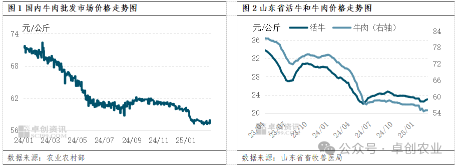 本周国内小公牛价格上涨明显,肉牛和牛肉主流市场价格微涨,当前国内是“缺牛不缺肉”的情况。据农业农村部数据显示,从全国农产品批发市场牛肉价格走势来看,截至2月26日全国牛肉周度均价为57.50元/公斤,较上一周上涨0.1元/公斤;山东省2025年第7周牛肉均价为55.10元/公斤,环比上涨0.13%,同比跌幅22.59%。