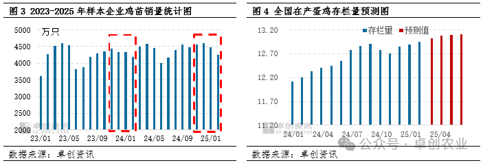 在产蛋鸡存栏量的高低主要受补栏和出栏两方面因素的影响。根据蛋鸡生长周期来看,2025年3-6月份新开产的蛋鸡应为2024年11月-2025年2月补栏的鸡苗。根据卓创资讯数据监测显示,此时间段鸡苗销量呈现先增后降的变化趋势,但是依旧处于相对高位。而所对应的出栏的老母鸡应为2023年11月-2024年2月份补栏的鸡苗,而此时间段的鸡苗销量呈现不断下降的趋势。同时对比两段时间的鸡苗销量数据来看,新开产蛋鸡数量持续高于淘汰的蛋鸡数量,进而使得在产蛋鸡存栏量将会持续处于增长状态,且到2025年6月份增至上半年的最高值。进而对鸡蛋价格产生利空影响。