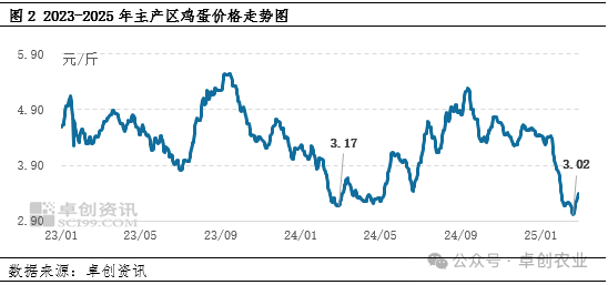 从需求方面来看,2025年2月初恰逢春节假期,销区市场休市,贸易商春节期间停收,市场需求快速下降。而节后贸易商虽有阶段性集中补货,但终端消费者仍处于消化库存阶段,叠加产区春节期间的库存压力,市场需求降至年内最低水平,鸡蛋价格承压走低。据卓创资讯数据监测显示,2月19日全国主产区鸡蛋均价3.02元/斤,较周期内上一低点3.17元/斤跌幅4.73%,为2023年以来的最低价。