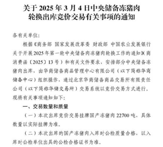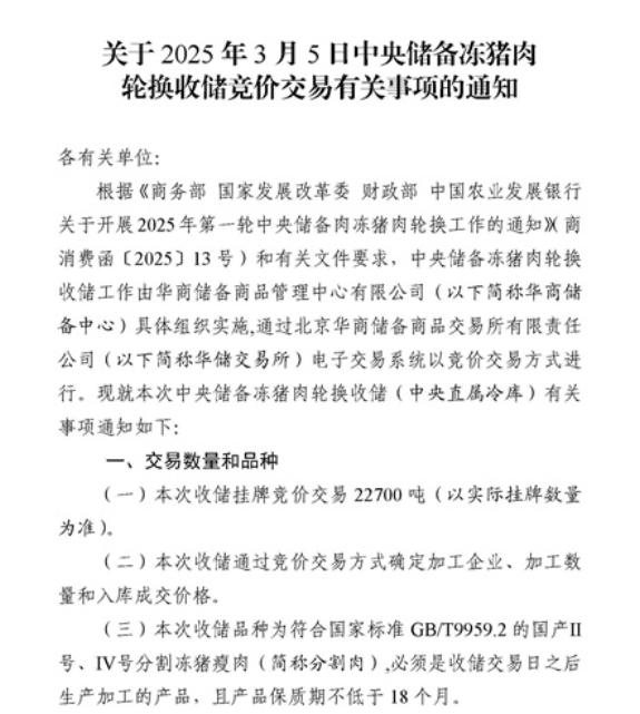 同日(2月28日),华储网发布《关于2025年3月5日中央储备冻猪肉轮换收储竞价交易有关事项的通知》称,本次收储挂牌竞价交易22700吨(以实际挂牌数量为准)。