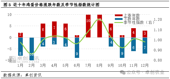 另外从需求方面来看,根据卓创资讯对近十年鸡蛋价格涨跌情况及季节性指数分析得到,6月份多数时间呈现下跌趋势。而从市场情况来看,6月份往往气温升高,南方梅雨天气影响严重,鸡蛋出现霉蛋、臭蛋情况突出,储存难度增加;同时进入6月中旬以后,各学校陆续放假,食堂采购量也相应缩减。终端整体需求呈现下降趋势。