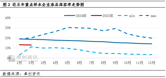 根据卓创资讯数据监测,2024年国内屠宰企业冻品库存压力较大,持续处于出库状态,鲜有主动入库现象,因此冻品库容率下滑。2025年出库动作大于入库动作,截止到2月底,全国重点样本企业冻品库容率为17.97%,接近近五年最低水平,因此现阶段国产冻品库存压力不大。另外港口库存压力亦不大,基于此背景下,国产冻品对进口产品冲击影响不大,进口贸易商存惜售情绪,对进口冻品价格形成一定支撑。