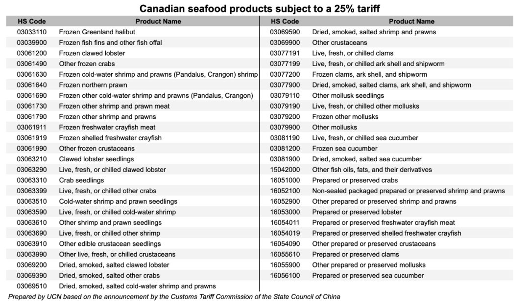 2025年3月20日起,中国将对原产于加拿大的部分进口商品加征关税,海产品税率为25%,适用于49款商品,包括格陵兰比目鱼、蟹类、波士顿龙虾、冷水虾和贝类。