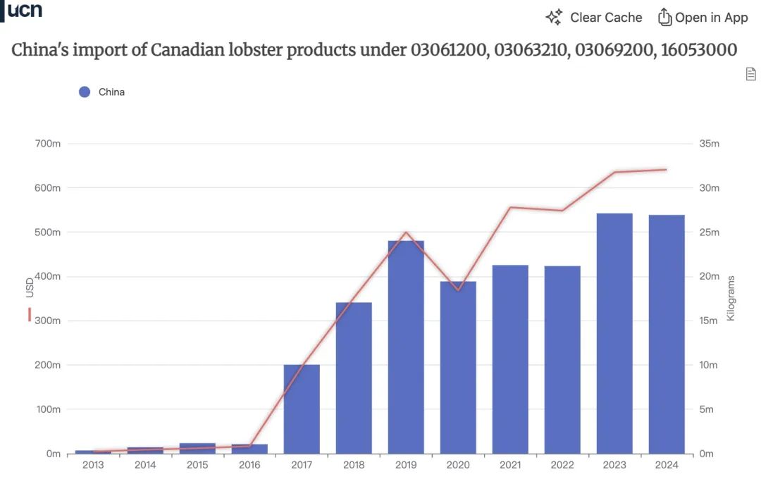 财政部网站显示,美国龙虾进口关税为37%(特别协定);加拿大龙虾关税为7%(最惠国税率)。如果加拿大龙虾被加征25%关税,总税率将达到32%,仍比美国龙虾低5%。