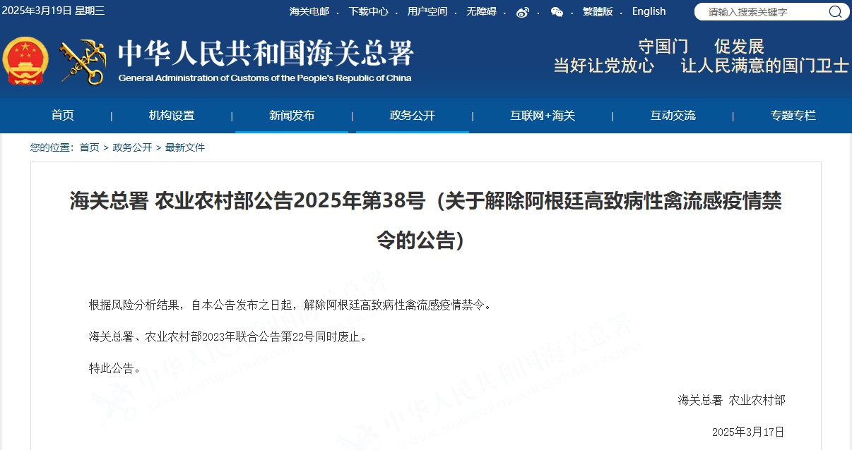 海关总署 农业农村部:关于解除阿根廷高致病性禽流感疫情禁令的公告