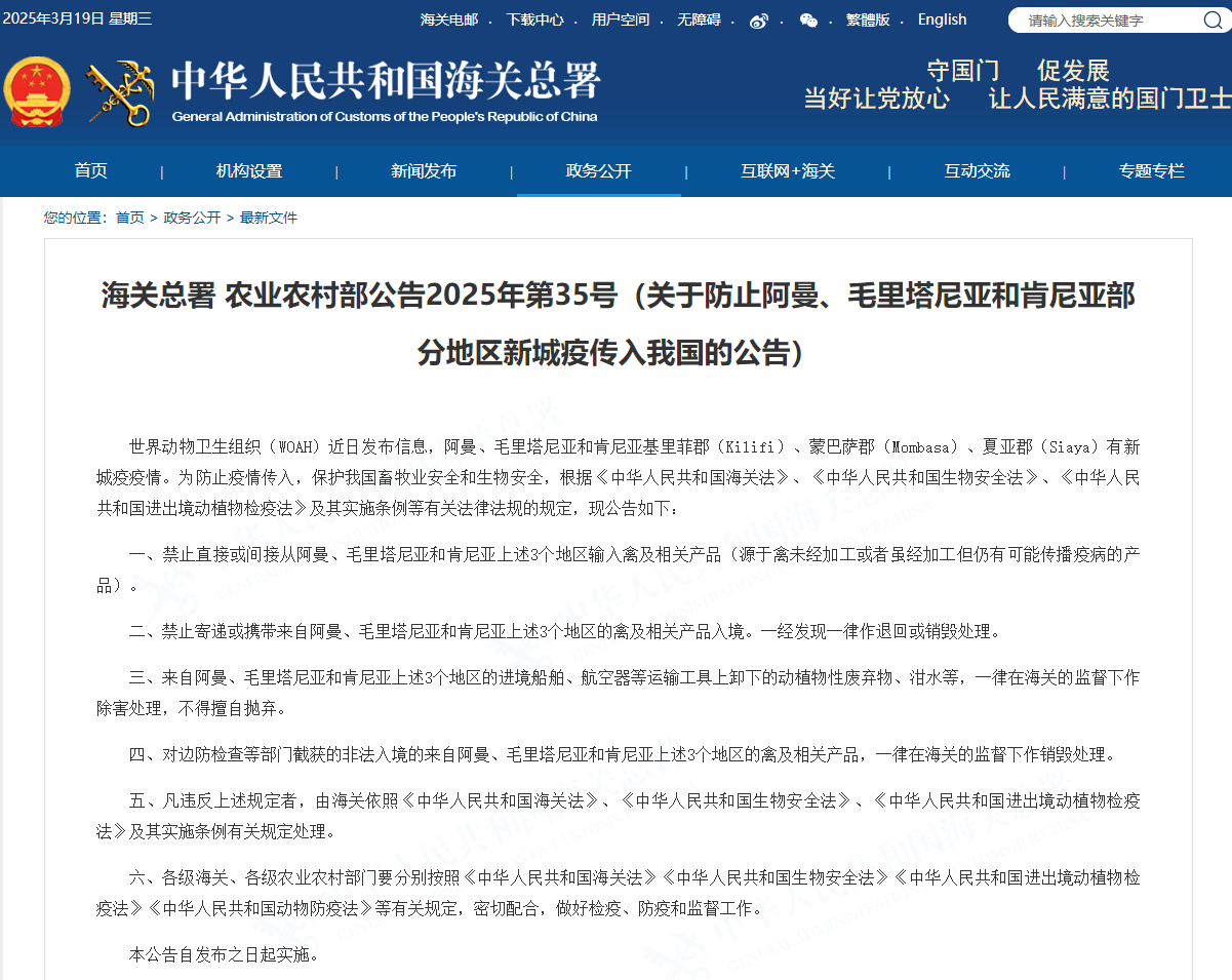 世界动物卫生组织(WOAH)近日发布信息,阿曼、毛里塔尼亚和肯尼亚基里菲郡(Kilifi)、蒙巴萨郡(Mombasa)、夏亚郡(Siaya)有新城疫疫情。为防止疫情传入,保护我国畜牧业安全和生物安全,根据《中华人民共和国海关法》、《中华人民共和国生物安全法》、《中华人民共和国进出境动植物检疫法》及其实施条例等有关法律法规的规定,现公告如下: