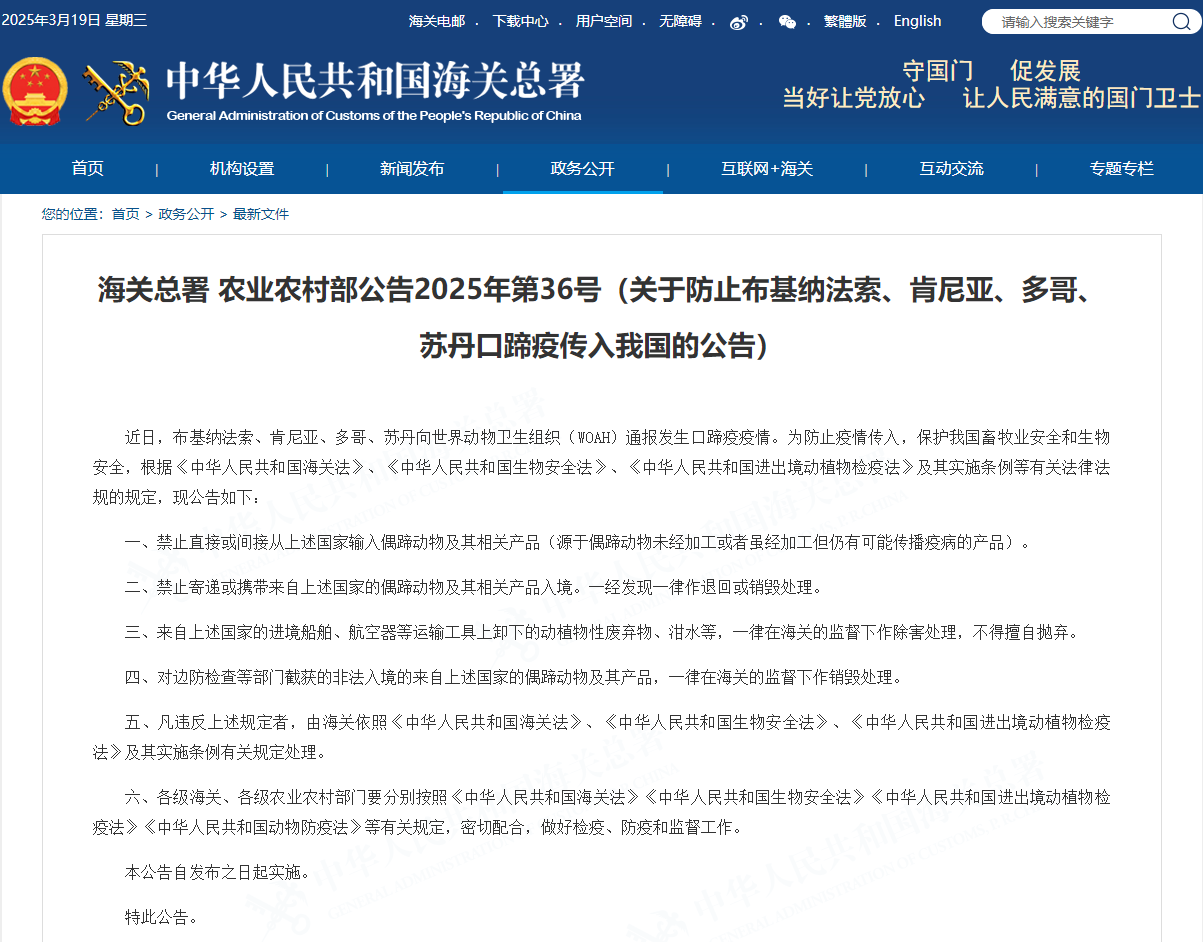 近日,布基纳法索、肯尼亚、多哥、苏丹向世界动物卫生组织(WOAH)通报发生口蹄疫疫情。为防止疫情传入,保护我国畜牧业安全和生物安全,根据《中华人民共和国海关法》、《中华人民共和国生物安全法》、《中华人民共和国进出境动植物检疫法》及其实施条例等有关法律法规的规定,现公告如下: