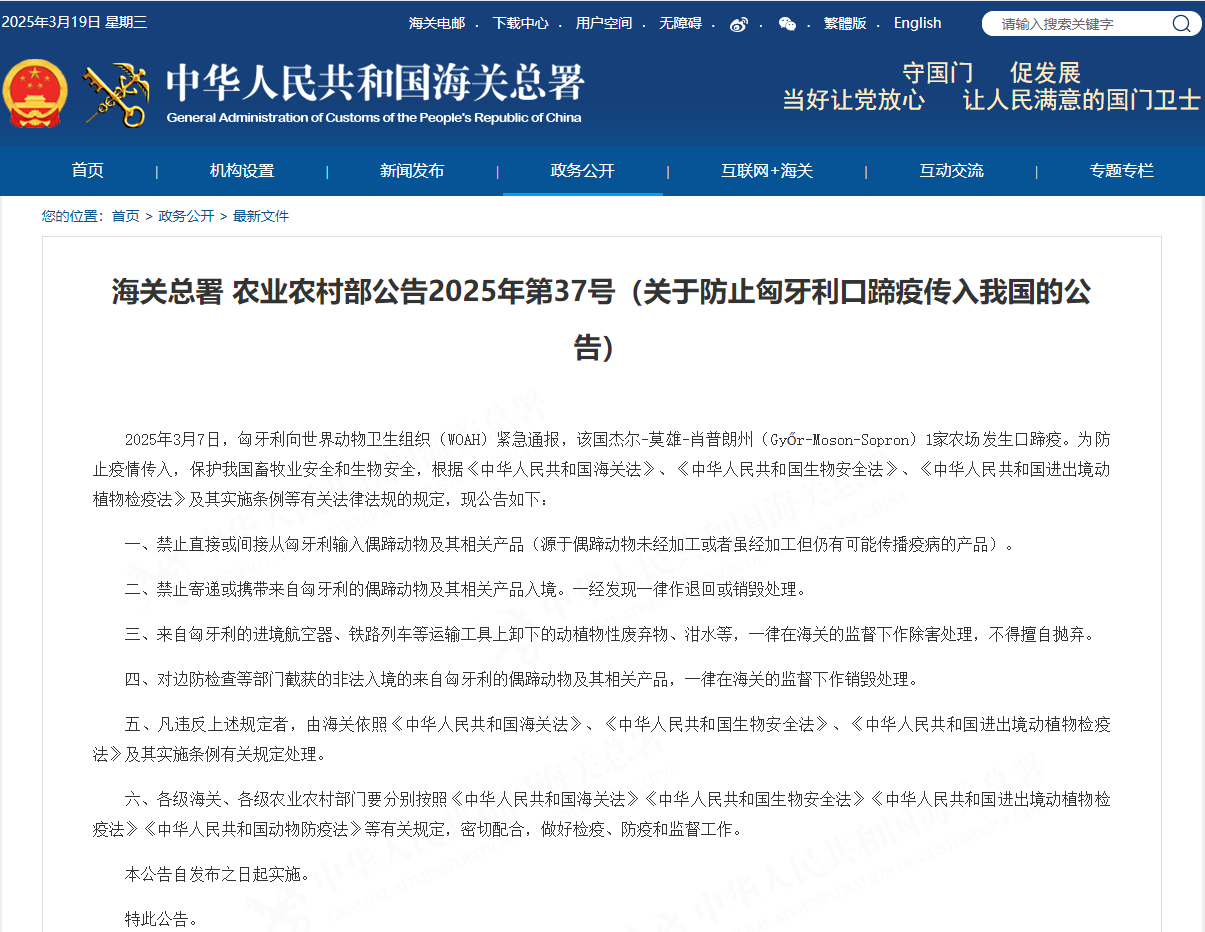 2025年3月7日,匈牙利向世界动物卫生组织(WOAH)紧急通报,该国杰尔-莫雄-肖普朗州(Győr-Moson-Sopron)1家农场发生口蹄疫。为防止疫情传入,保护我国畜牧业安全和生物安全,根据《中华人民共和国海关法》、《中华人民共和国生物安全法》、《中华人民共和国进出境动植物检疫法》及其实施条例等有关法律法规的规定,现公告如下: