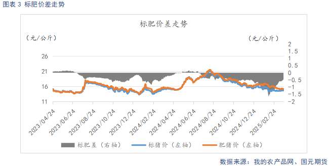 12月腌腊期间的集中出栏下,猪价持续走弱。进入1月初,大猪供应偏紧,养殖端压栏情绪升温,出栏节奏放缓,供应端的短暂收紧支撑猪价止跌反弹,猪价重回16元/公斤以上。不过1月出栏窗口期较短,压栏操作延续性不足,随着供应逐步增加,猪价再次走弱。盘面则由于前期下跌幅度较大,提前兑现了节后偏空预期,主力2503合约止跌企稳。但仍受供需宽松预期压制,在13000元/吨上下震荡整理。进入2月,春节后需求步入淡季,猪价快速走弱。由于大猪节前集中出栏,节后大猪供应偏紧,标肥价差在节后走扩,处于偏高水平,养殖端压栏、二育情绪升温,短暂支撑猪价止跌反弹。随着价格回暖,需求端承接力度不足,加之标肥价差收缩,养殖端逢高出栏意愿上升,二育情绪降温,供给端重回宽松局面,猪价再次走弱。2503、2505合约作为淡季合约,供强需弱格局下,整体承压。不过节前盘面已通过持续下行,提前交易了节后看空预期,继续下探的空间不足,盘面维持低位震荡行情。3月,养殖端压栏挺价,叠加零星二育入场截留,供给端压力减弱。需求端则处于季节性淡季,需求恢复缓慢,供需双弱下,现货走势在14.5元/公斤附近窄幅波动。主力2505合约则临近主力换月,在期现价差修复推动下反弹至13500元/吨附近,期现价差逐步缩窄。
