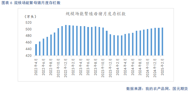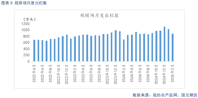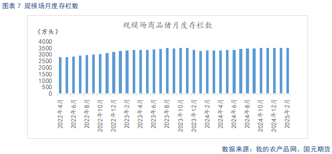 据Mysteel统计,截止2025年2月底,规模场能繁母猪存栏量为504.46万头,环比上调0.05%,同比增长4.86%。进入2月,疫病影响逐步减弱,加之养殖端仍有一定盈利空间,去产能意愿不强,能繁母猪存栏小幅上调。自24年3月起,养殖利润回暖支撑下,规模场产能逐步回升,从生产周期推算,2025年规模场理论产能呈现环比上升态势。规模场2月商品猪存栏数为3535.02万头,环比增加0.51%,同比增加6.87%。规模场2月商品猪出栏量为885.01万头,环比下降14.04%,同比增加26.98%。2月出栏天数较少,加之春节后标肥价差走扩,养殖端有一定压栏操作,整体出栏量环比大幅下降。3月出栏天数大于2月,规模场出栏计划增加,预计3月出栏量将环比增长。