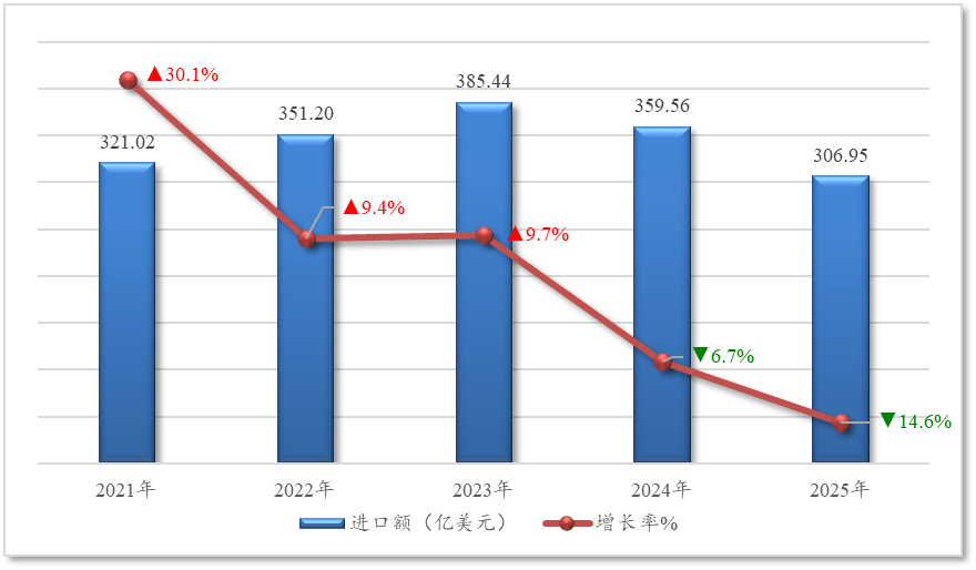 据海关统计,2025年1-2月,我国农产品进口总额307亿美元,比上年同期下降14.6%,降至近五年同期最低值。农产品进口额占我国外贸进口总额8.3%。