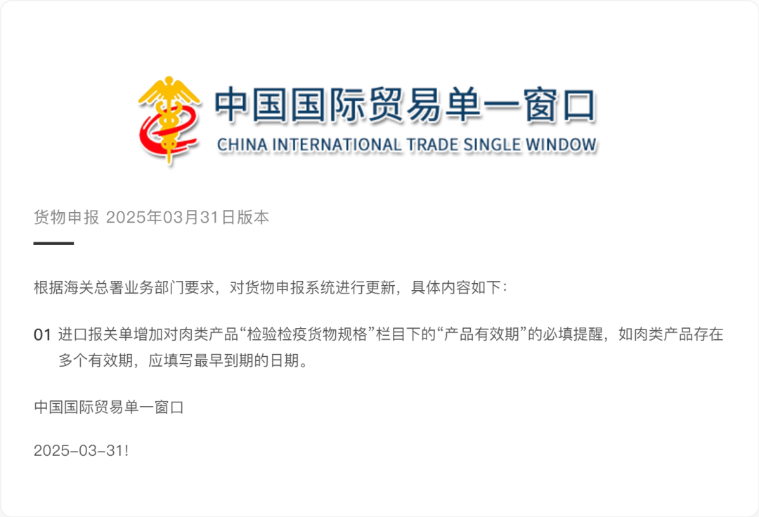 02 | 进口报关单增加对肉类产品“产品有效期”的必填提醒 |
