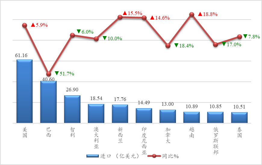 2025年前2个月,我国农产品前十大进口市场进口额占农产品进口总额73.2%。美国是我农产品第一大进口市场,累计进口额61.2亿美元,比上年同期增长5.9%,占我农产品进口总额19.9%。巴西排名第二位,累计进口额40.6亿美元,比上年同期下降51.7%,占我农产品进口总额13.2%。智利排名第三位,累计进口额26.9亿美元,比上年同期下降6%,占我农产品进口总额8.8%。在前十大进口市场中,进口额降幅最高的是巴西,其次是加拿大,进口额同比下降18.4%。
