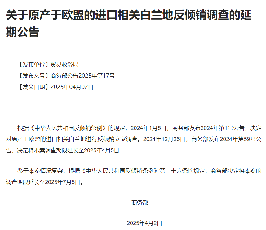 据《中华人民共和国反倾销条例》的规定,2024年1月5日,商务部发布2024年第1号公告,决定对原产于欧盟的进口相关白兰地进行反倾销立案调查。2024年12月25日,商务部发布2024年第59号公告,决定将本案调查期限延长至2025年4月5日。