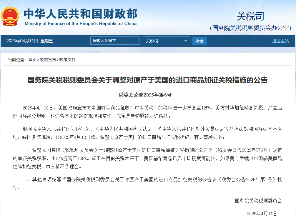 一、调整《国务院关税税则委员会关于调整对原产于美国的进口商品加征关税措施的公告》(税委会公告2025年第5号)规定的加征关税税率,由84%提高至125%。鉴于在目前关税水平下,美国输华商品已无市场接受可能性,如果美方后续对中国输美商品继续加征关税,中方将不予理会。