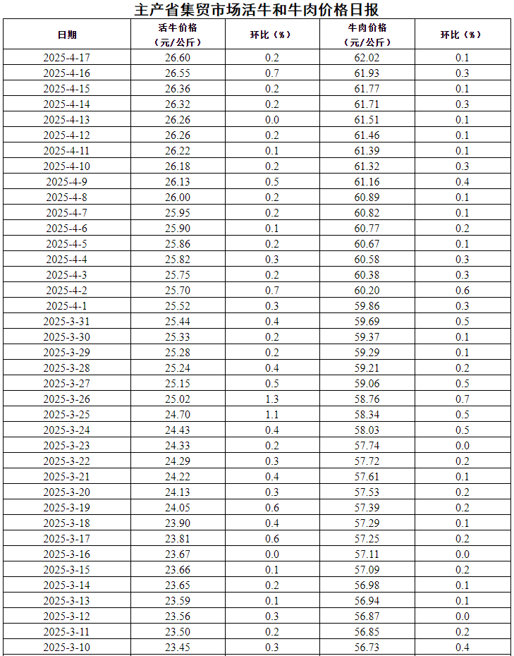 据农业农村部监测,2025年4月17日,主产省集贸市场活牛价格26.60元/公斤,同比上涨6.7%,环比上涨0.2%,自3月2日起连续上涨47天,累计上涨3.88元,涨幅17.1%;牛肉价格62.02元/公斤,同比下跌3.9%,环比上涨0.1%,自3月2日起震荡上行,累计上涨5.99元,涨幅10.7%。