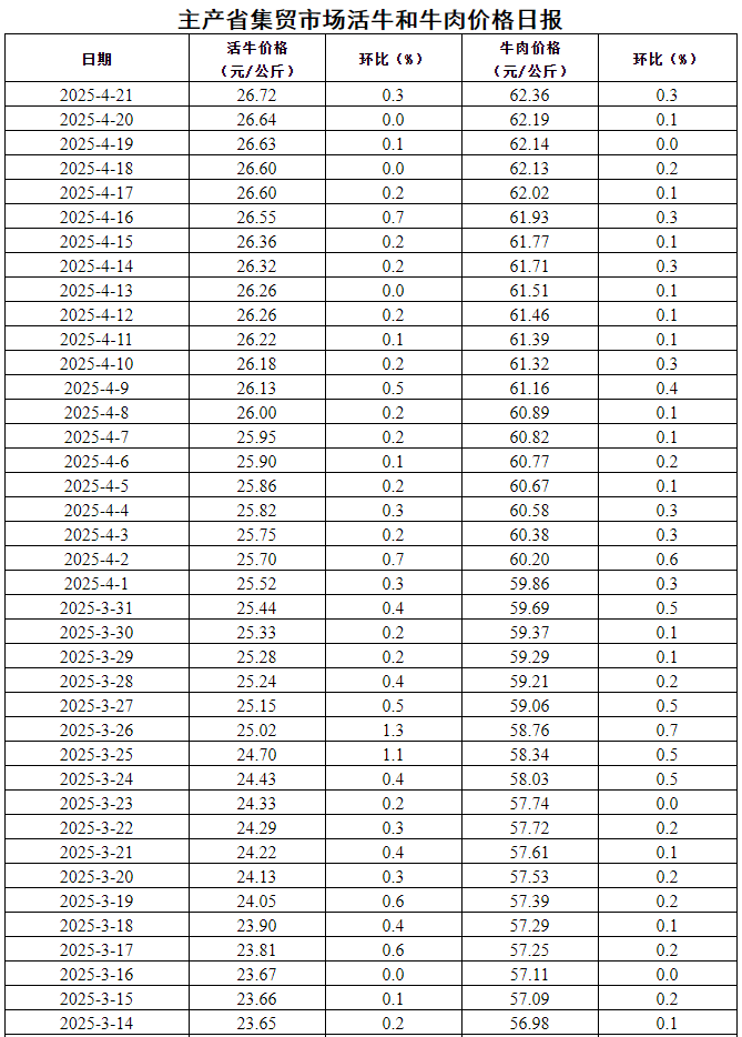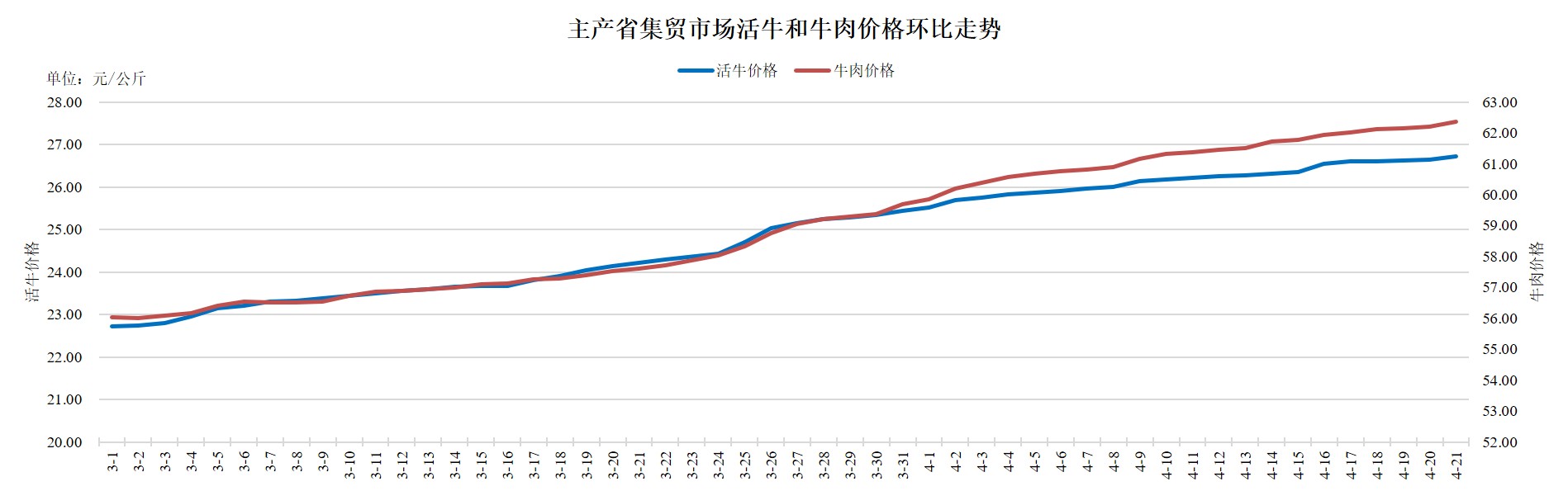 4月21日主产省集贸市场活牛和牛肉价格环比均上涨0.3%